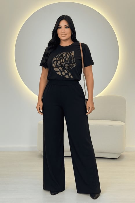 Conjunto Calça Pantalona e Cropped (onça) Viscolycra