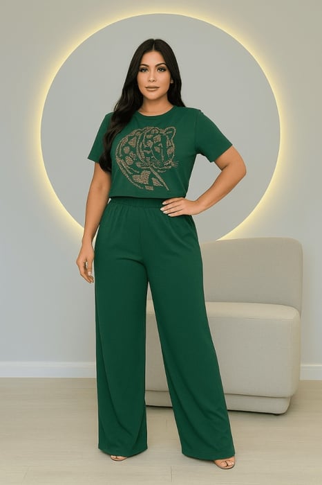 Conjunto Calça Pantalona e Cropped (onça) Viscolycra